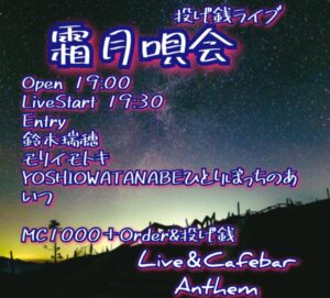 11/1(土)八王子Live&Cafebar Anthem 霜月唄会 OPEN19:00/START19:30 Music Charge1,000+Order&投げ銭 [出演] Entry 鈴木瑞穂 森居モトキ YoshioWatanabeひとりぼっちのあいつ(The Youngman Psycho Blues) ※ワタナベ・ヤング・ヨシオ、ソロでの出演となります。
