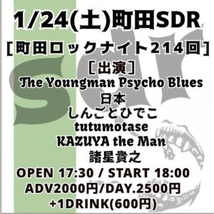 1/24(土)町田SDR                       [町田ロックナイト214回]                   The Youngman Psycho Blues                日本                            しんごとひでこ                       tutumotase                        KAZUYA the man                      諸星貴之                                                         OPEN17:30/START18:00                       ADV2000円/DAY.2500円 +1DRINK(600円)