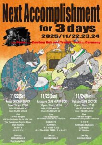 11/22(土)福生チキンシャック                THE NUT BURGERS企画                   Next Accomplishment for 3days            Open/Start 17:30                     adv/¥2500 door/¥3000 共にd別 [出演]                           THE NUT BURGERS with Peter from Cowboy Bob and Trailer Trash、The Youngman Psycho Blues、Shell Rockets、Jet 50‘s、ロクロクリン           ---------------------------------------------                                                           Dee Jay                          SHIDARUMBLE、Ryo(Maria Club)