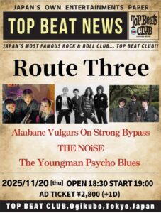 11/20(木)荻窪Top Beat Club                                                  【Route Three】                   https://peatix.com/event/4604498                                      【開場/開演】18:30 / 19:00            【前売】¥2,800 (+1D)                【出演】                          Akabane Vulgars On Strong Bypass           THE NOiSE                        The Youngman Psycho Blues